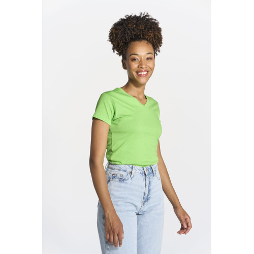 Playera de mujer de manga corta en cuello V, 100% algodón. Etiqueta removible. Ideal para serigrafía y transfer. 100% algodón peinado. Gramaje: 145 gr.